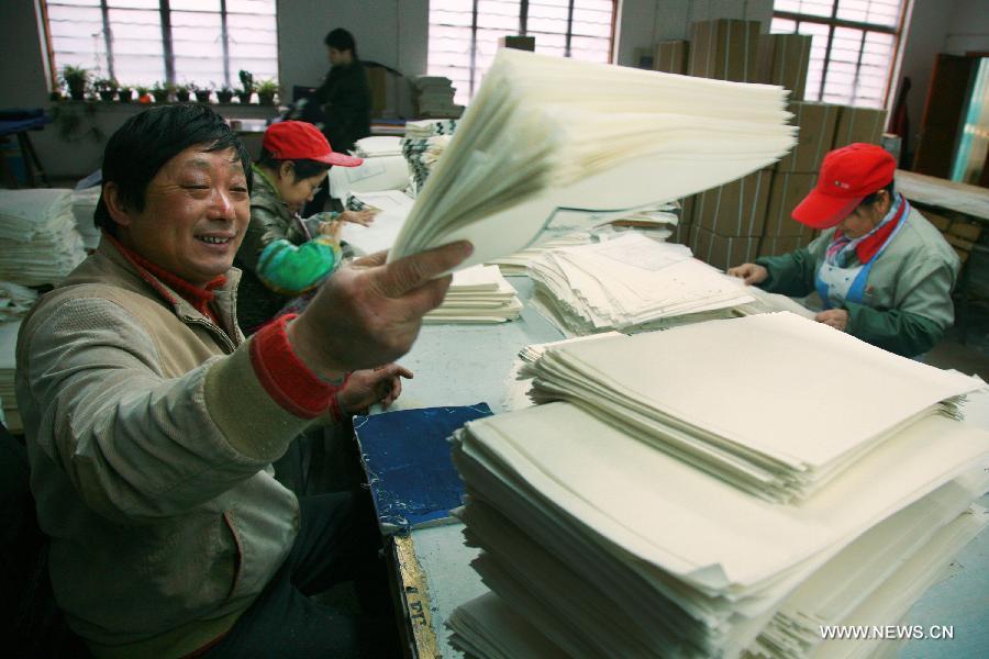 A worker piles up pages at the Guangling Ancient Books Printing Society in Yangzhou, east China's Jiangsu Province, Feb. 25, 2014. The technique of block printing, with a history of over 2,000 years, was listed as a state intangible cultural heritage of China in 2006. In order to better protect the technique, the Guangling Ancient Books Printing Society was founded in Yangzhou in 1958. The society has maintained the only full set of block printing technique in China. (Xinhua/Cui Genyuan)