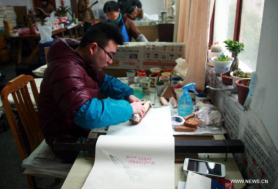 A worker does the printing at the Guangling Ancient Books Printing Society in Yangzhou, east China's Jiangsu Province, Feb. 25, 2014. The technique of block printing, with a history of over 2,000 years, was listed as a state intangible cultural heritage of China in 2006. In order to better protect the technique, the Guangling Ancient Books Printing Society was founded in Yangzhou in 1958. The society has maintained the only full set of block printing technique in China. (Xinhua/Cui Genyuan)