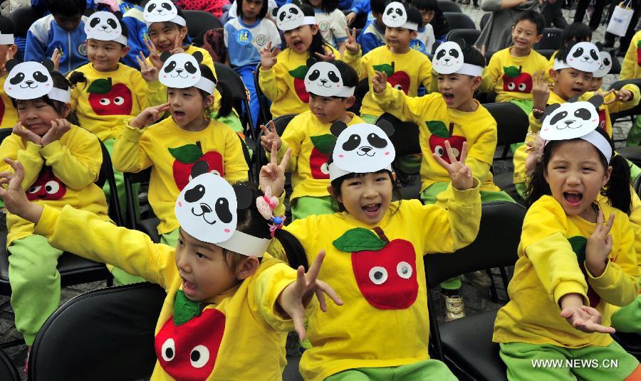 Young kids attend the launching ceremony of an open-air exhibition titled "Pandas World Tour - Taipei" at the Citizens' Square in Taipei, southeast China's Taiwan, Feb. 27, 2014. A total of 1,600 pandas and Formosan black bears made of environmentally-friendly paper material went on show here on Thursday. The event aims at promoting environmental protection and raising the public's awareness of animal preservation. All of the paper pandas and black bears on display will be open for charity sale after the event concludes on March 30. (Xinhua/Wu Ching-teng)