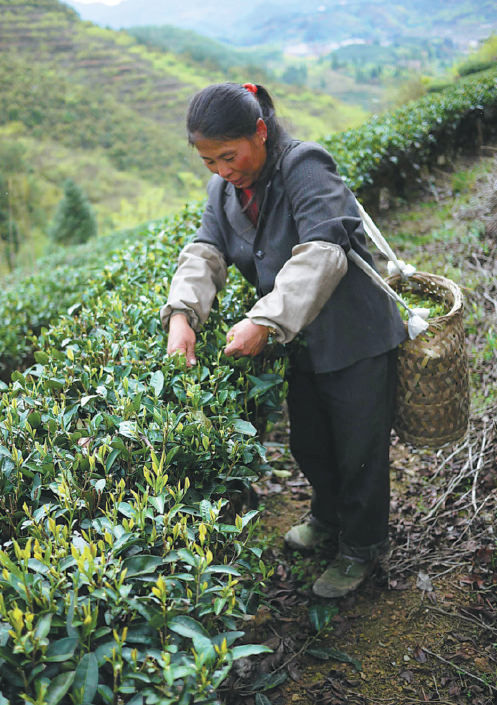 A tea grower in northern Fujian province picks tea leaves. The leaves harvested range from unopened buds to the top three leaves.[China Daily] |