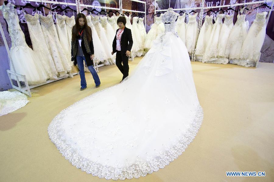Visitors look at wedding dresses during the Beijing International Wedding Culture Expo in Beijing, capital of China, Feb. 28, 2014. The three-day expo kicked off at the Beijing Exhibition Center on Friday. (Xinhua/Zhao Bing)