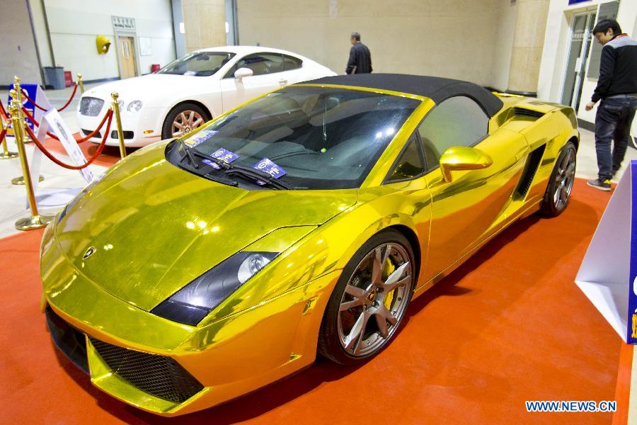 Visitors look at wedding cars presented during the Beijing International Wedding Culture Expo in Beijing, capital of China, Feb. 28, 2014. The three-day expo kicked off at the Beijing Exhibition Center on Friday. (Xinhua/Zhao Bing)