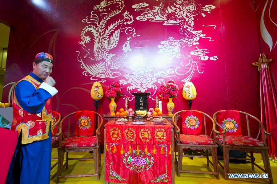 A staff member of the expo presents a traditional wedding ceremony during the Beijing International Wedding Culture Expo in Beijing, capital of China, Feb. 28, 2014. The three-day expo kicked off at the Beijing Exhibition Center on Friday. (Xinhua/Zhao Bing)