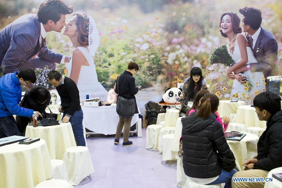 Visitors consult staff members of the expo about the wedding photography during the Beijing International Wedding Culture Expo in Beijing, capital of China, Feb. 28, 2014. The three-day expo kicked off at the Beijing Exhibition Center on Friday. (Xinhua/Zhao Bing)