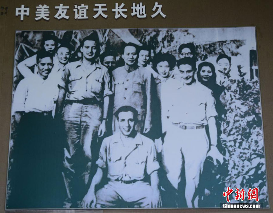 Documentary photograph of Mao Zedong and the pilots taken in Chongqing after the victory against Japanese aggression is exhibited in the Museum. The caption reads: Long live the Sino-American friendship. (Photo/Chinanews.com) |