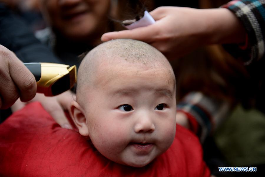 A kid has his hair cut on the Leijie Square in Hefei, capital of east China's Anhui Province, March 2, 2014, on the occasion of the second day of the second lunar month, known in Chinese as Er Yue Er, "a time for the dragon to raise its head", as a Chinese saying goes. (Xinhua/Zhang Duan)