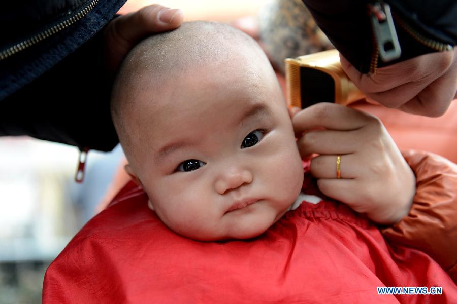 A kid has his hair cut on the Leijie Square in Hefei, capital of east China's Anhui Province, March 2, 2014, on the occasion of the second day of the second lunar month, known in Chinese as Er Yue Er, "a time for the dragon to raise its head", as a Chinese saying goes. (Xinhua/Zhang Duan)