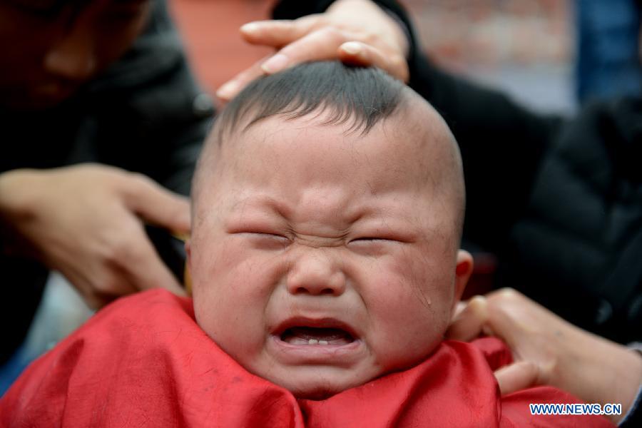 A kid has his hair cut on the Leijie Square in Hefei, capital of east China's Anhui Province, March 2, 2014, on the occasion of the second day of the second lunar month, known in Chinese as Er Yue Er, "a time for the dragon to raise its head", as a Chinese saying goes. (Xinhua/Zhang Duan) |