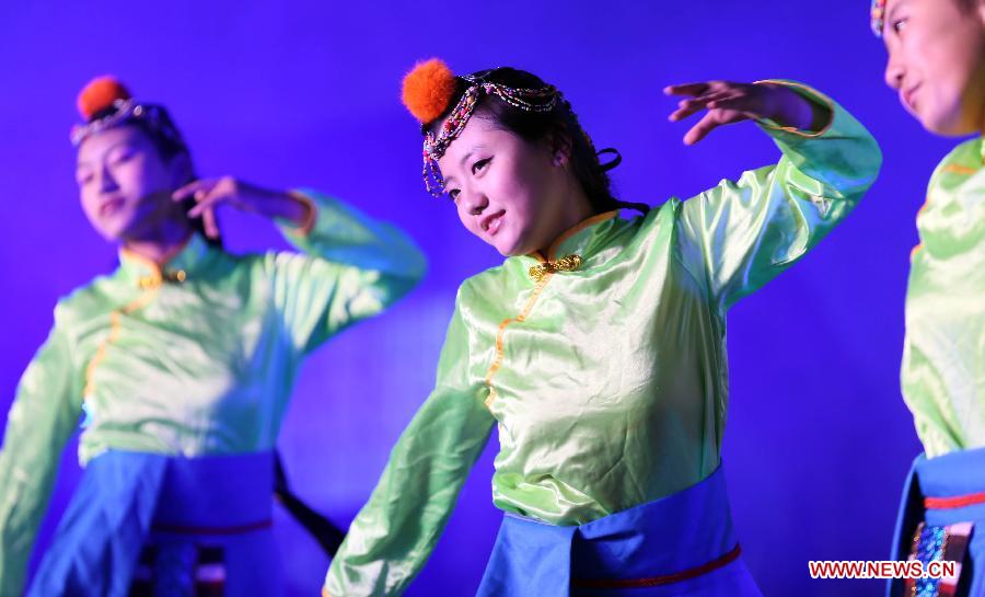 Students of Nantong Tibetan Ethnic Middle School perform Tibetan folk dance in Nantong city, east China's Jiangsu province, March 2, 2014. Youth of Tibetan ethnic group in Nantong celebrated the Tibetan New Year on Sunday. The Tibetan New Year, which falls on Sunday this year according to the Tibetan calendar, is the most important festival for Tibetans. (Xinhua/Xu Peiqin)