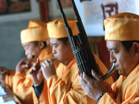 This concern is not groundless. Normally a Jing Music band consists of at least nine players, now downsized to five. “I took on a few students, who all quit later. One of them, a flute player, had the gift, but still failed to persevere.” The reason? Hu shook his head, “Money. In this vocation one cannot earn enough to support a family. A full year’s performances at the temple cannot even generate enough to buy a nice mobile phone.”