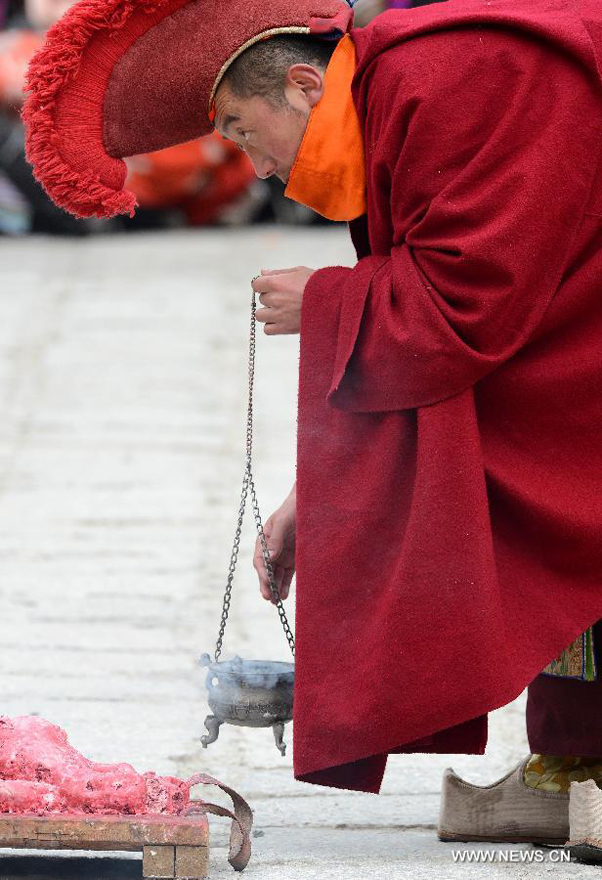 A Tibetan Buddhist monk offers incense to deities during a Cham dance ritual held to celebrate the upcoming Losar at the Tsurphu Monastery in Doilungdeqen County of Lhasa, capital of southwest China's Tibet autonomous region, Feb. 28, 2014. The Cham dance is a ritual performed by Tibetan Buddhist monks to exorcise evil spirits. The dancers wear masks of various animals and mythical figures as they perform to the accompaniment of religious music. At the Tsurphu Monastery, a main base of the Kagyu school in Tibetan Buddhism, the Cham dance is usually performed two days ahead of the Losar, the Tibetan New Year, which falls on March 2 in 2014. [Xinhua/Chogo]