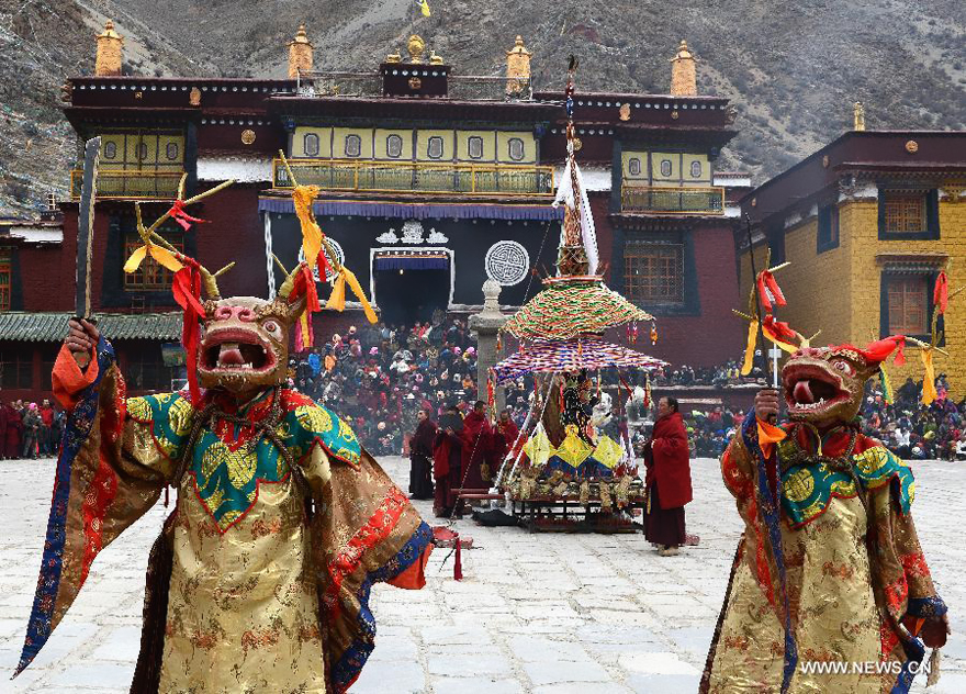 Masked Tibetan Buddhist monks perform during a Cham dance ritual held to celebrate the upcoming Losar at the Tsurphu Monastery in Doilungdeqen County of Lhasa, capital of southwest China's Tibet autonomous region, Feb. 28, 2014. The Cham dance is a ritual performed by Tibetan Buddhist monks to exorcise evil spirits. The dancers wear masks of various animals and mythical figures as they perform to the accompaniment of religious music. At the Tsurphu Monastery, a main base of the Kagyu school in Tibetan Buddhism, the Cham dance is usually performed two days ahead of the Losar, the Tibetan New Year, which falls on March 2 in 2014. [Xinhua/Chogo]
