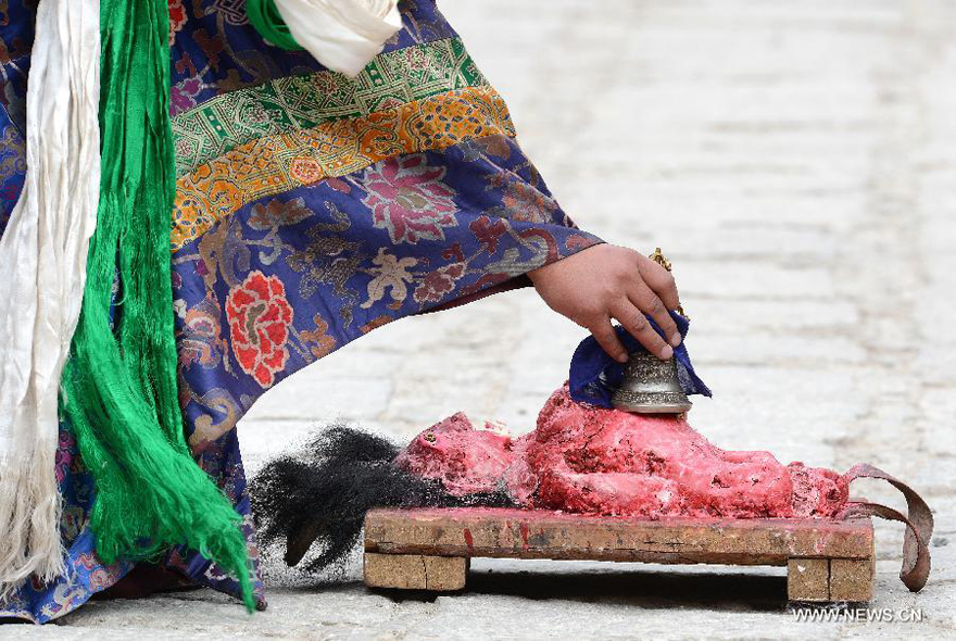 A Tibetan Buddhist monk "tames" a mimic evil spirit made with Tsampa, a barley flour foodstuff, during a Cham dance ritual held to celebrate the upcoming Losar at the Tsurphu Monastery in Doilungdeqen County of Lhasa, capital of southwest China's Tibet autonomous region, Feb. 28, 2014. The Cham dance is a ritual performed by Tibetan Buddhist monks to exorcise evil spirits. The dancers wear masks of various animals and mythical figures as they perform to the accompaniment of religious music. At the Tsurphu Monastery, a main base of the Kagyu school in Tibetan Buddhism, the Cham dance is usually performed two days ahead of the Losar, the Tibetan New Year, which falls on March 2 in 2014. [Xinhua/Chogo]