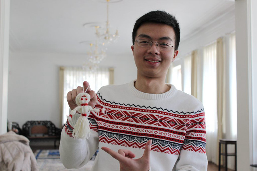 A Bulgarian major student from Beijing Foreign Studies University shows his Martenitsa.(People’s Daily Online/ Xing Lu)
