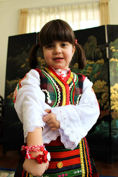 A Bulgarian girl dressed in traditional costumes shows her Martenitsa.(People’s Daily Online/ Xing Lu)