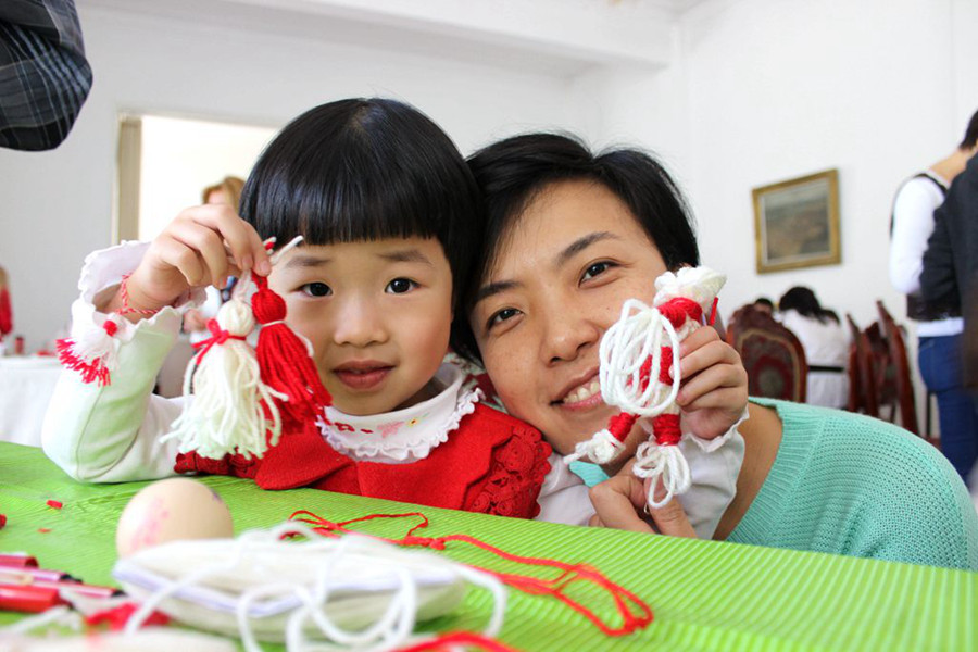 A Bulgarian teacher from Beijing Foreign Studies University makes Martenitsa with her daughter.(People’s Daily Online/ Xing Lu)
