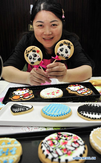 An exhibitor shows hand-drawing biscuits at a press conference on the 2014 International Bakery Show in Taipei, southeast China's Taiwan, March 4, 2014. The annual bakery show will be held from March 13 to 16, showcasing bakery related products and food. (Xinhua/Wu Ching-teng)