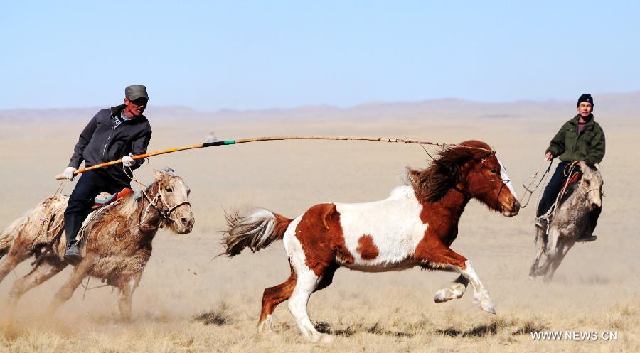 A herdsman tries to lasso a horse during a competition in Wengeng Township of Bayannur City, north China's Inner Mongolia Autonomous Region, March 4, 2014. (Xinhua/Zhi Maosheng)