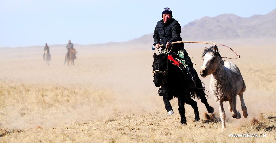 A herdsman tries to lasso a horse during a competition in Wengeng Township of Bayannur City, north China's Inner Mongolia Autonomous Region, March 4, 2014. (Xinhua/Zhi Maosheng)