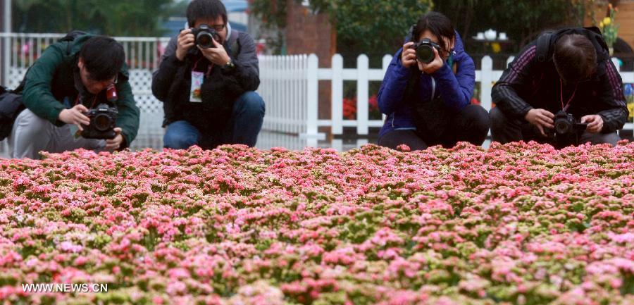 Reporters take pictures of flowers at the site of 2014 Hong Kong Flower Show in south China's Hong Kong, March 6, 2014. The Leisure and Cultural Services Department of Hong Kong held a press conference Thursday, announcing that the 2014 flower show will be held from March 7 to March 16 at Victoria Park in Causeway Bay. (Xinhua/Lui Siu Wai)
