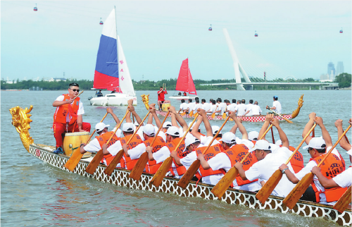 A dragon boat competition at the Jinhewan Wetland Park [ZHANG DAFANG/CHINA DAILY]
