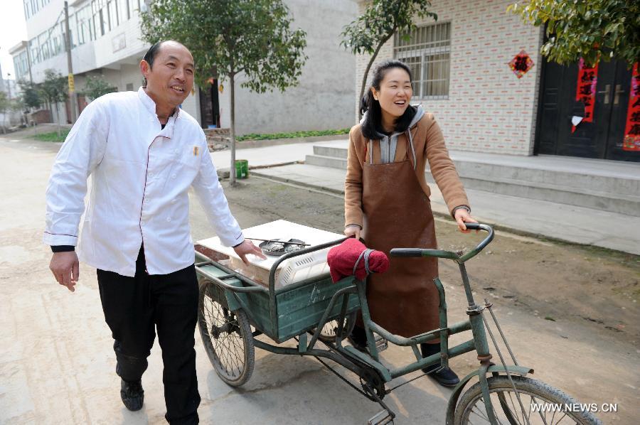 Na Yoonseon (R) and tofu-maker Qi Yulin sell handmade tofu on a street in Huainan City, east China's Anhui Province, March 4, 2014. Na Yoonseon, a teacher from Cheju Halla University of South Korea, commenced her teaching career in China since September of 2012. As a tofu lover, she came to the Qixu Village of Huainan City which is renowned for tofu-making for learning various local tofu recipes. "My dream is to bring Huainan tofu recipes home and let more people taste it," said Na Yoonseon. (Xinhua/Chen Bin)