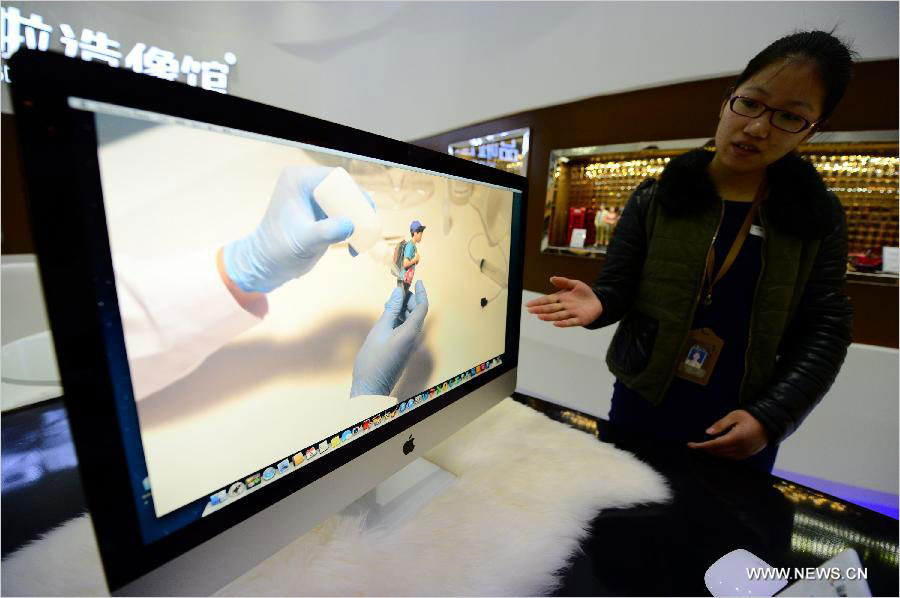 A screen displays the working process of a wax figure at a 3D-print wax work studio in Nanjing, east China's Jiangsu Province, March 6, 2014. Consumers could pay for wax figures of themselves in various sizes made by the 3D printer in the studio, which will spend two weeks in making after a full-body scan for 3-5 minutes. [Photo: Xinhua/Shen Peng]