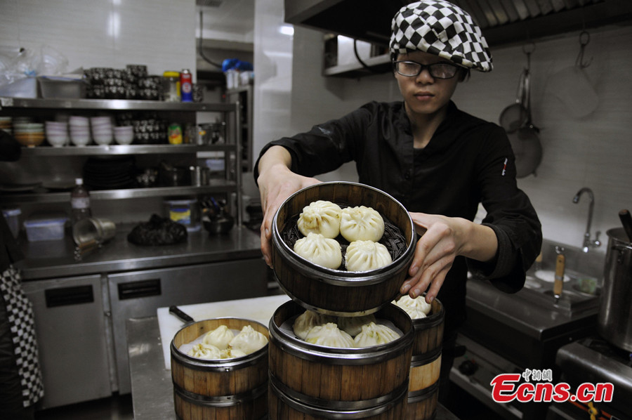A staff member shows Qingfeng steamed buns, transported by air from Beijing, at a restaurant in Hefei of east China's Anhui province on Mar. 10, 2014. According to the restaurant's manager, they ordered the first batch of 1,000 vacuum-packed buns from Beijing's Qingfeng restaurant and every customer can taste one for free. Qingfeng, which is best-known for its steamed buns, has its sales surge after Chinese President Xi Jinping dropped by for lunch at one of its branches on Dec. 28, 2013. [Photo: China News Service / Han Suyuan]