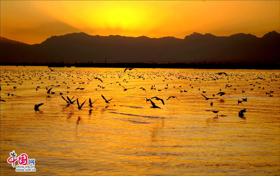 Sand Lake, 56 kilometers north of Yinchuan, the capital city of Ningxia Hui Autonomous Region, offers a rare view of a combination of desert and lake. Home to hundreds of species of birds, it is also an ideal place for bird watching. [China.org.cn]
