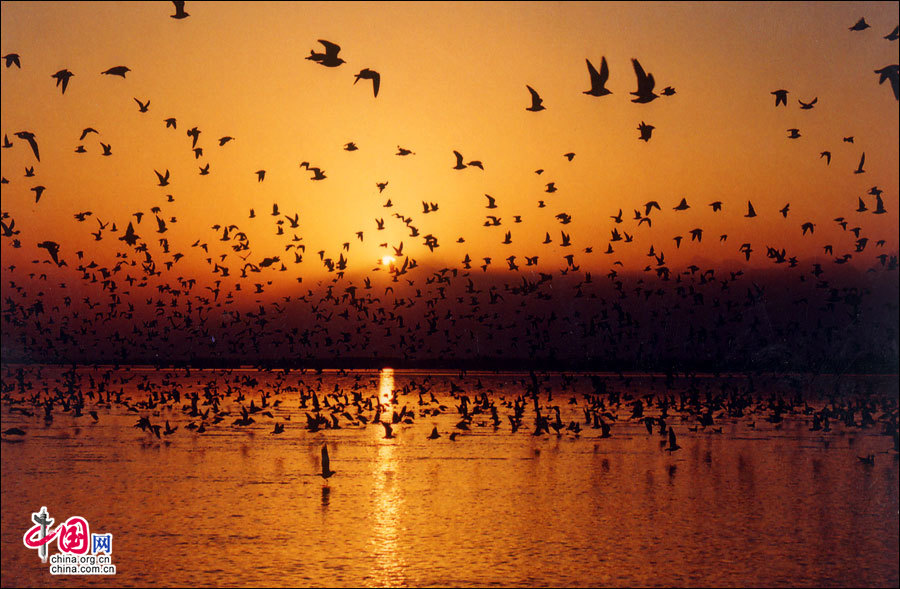 Sand Lake, 56 kilometers north of Yinchuan, the capital city of Ningxia Hui Autonomous Region, offers a rare view of a combination of desert and lake. Home to hundreds of species of birds, it is also an ideal place for bird watching. [China.org.cn]