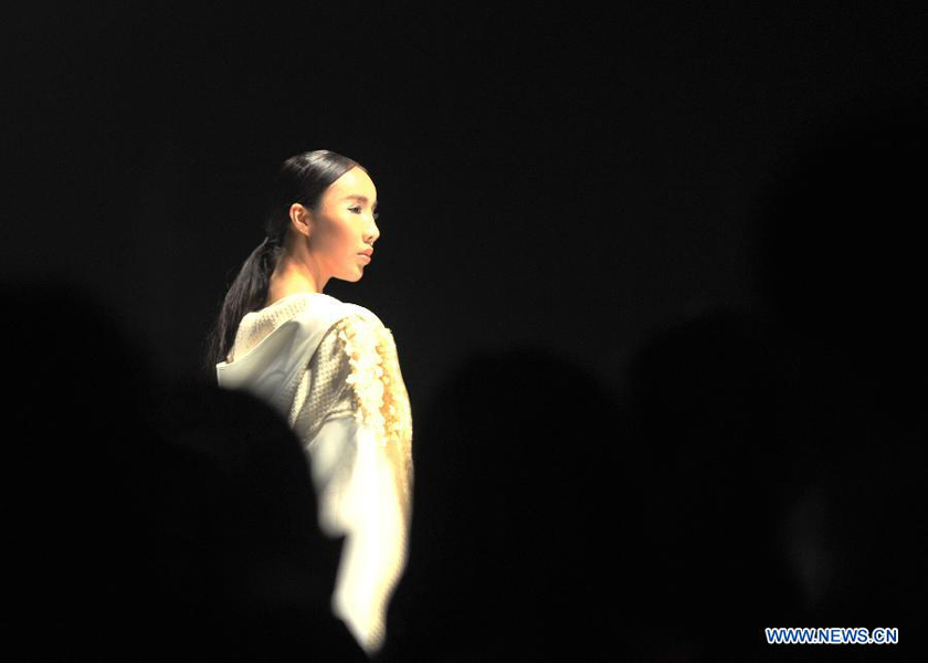 A model presents a creation during a fashion show of Beijing Institute of Fashion Technology in Beijing, capital of China, March 11, 2014. (Xinhua/Li Wen)