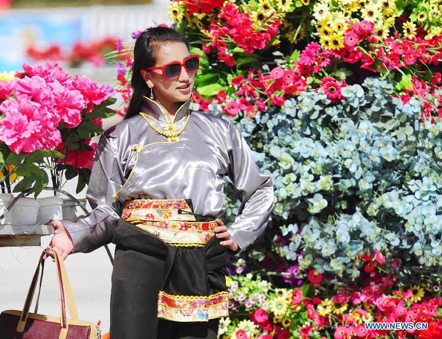 A woman of the Tibetan ethnic group wearing a traditional costume visits the square of the Potala Palace in Lhasa, capital of southwest China's Tibet autonomous region, March 5, 2014. People of the Tibetan ethnic group embraced the 'Wood Horse Losar' on March 2, the first day of the Tibetan New Year. The 'Losar' is ususally celebrated for 15 days, during which people have a tradition to wear their gorgeous costumes. [Xinhua/Liu Kun]