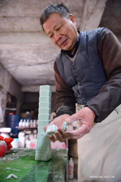 Porcelain artisan Zhang Maosheng demonstrates a piece of work based on the Taipei 101 at his studio in Jingdezhen, east China's Jiangxi Province, March 11, 2014. The porcelain skyscraper is made up of six stationery parts: a writing brush holder, a seal box, a water container, a writing brush pot, a flower receptacle and a brush-cleaning tray. Zhang has crafted porcelain works based on a number of landmark architectures and key events in China. His studio is located in a small alleyway in Jingdezhen, known as China's "porcelain capital" for its tradition of porcelain making. (Xinhua/Zhou Mi)