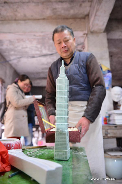 Porcelain artisan Zhang Maosheng demonstrates a piece of work based on the Taipei 101 at his studio in Jingdezhen, east China's Jiangxi Province, March 11, 2014. The porcelain skyscraper is made up of six stationery parts: a writing brush holder, a seal box, a water container, a writing brush pot, a flower receptacle and a brush-cleaning tray. Zhang has crafted porcelain works based on a number of landmark architectures and key events in China. His studio is located in a small alleyway in Jingdezhen, known as China's "porcelain capital" for its tradition of porcelain making. (Xinhua/Zhou Mi)