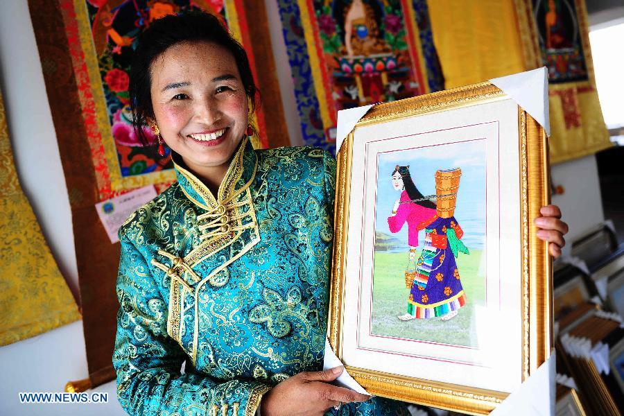 Herdwoman Changmaocuo shows her Tibetan embroidery at a workshop in Guinan County of Hainan Tibetan Autonomous Prefecture, northwest China's Qinghai Province, March 13, 2014. Local government opened Tibetan embroidery classes for local farmers and herdsmen for free and more than 1,200 people here have benefited from the handicraft. (Xinhua/Li Shaopeng)