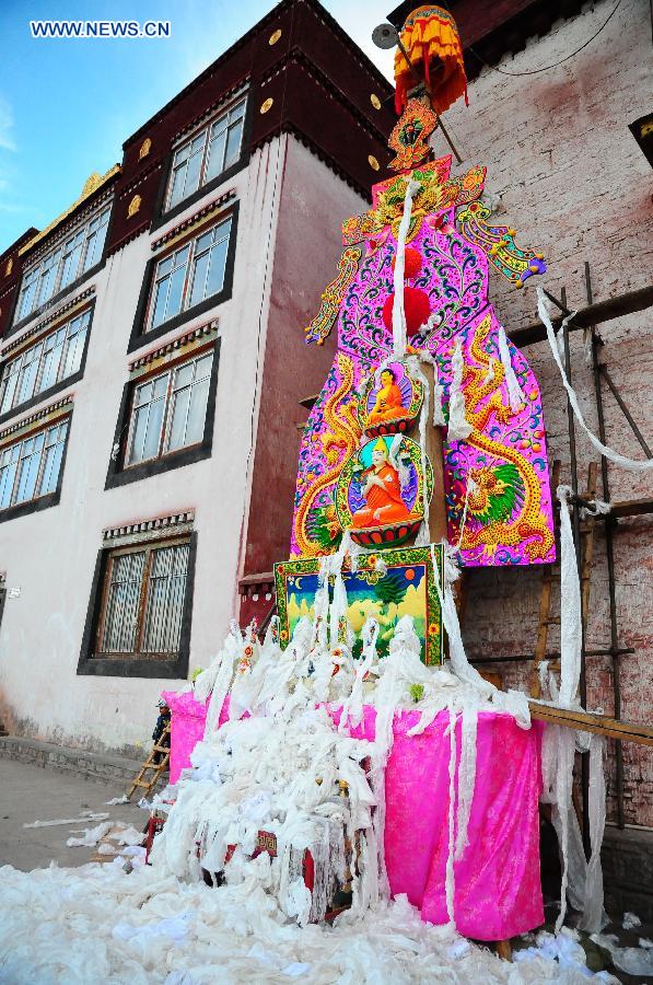 Photo taken on March 16, 2014 shows a butter sculpture displayed during the Butter Lamp Festival at the Jampaling Temple in Qamdo, southwest China's Tibet Autonomous Region. The Butter Lamp Festival kicked off on Sunday, the 15th day of the first month in Tibetan calendar. (Xinhua/Wang Shoubao)