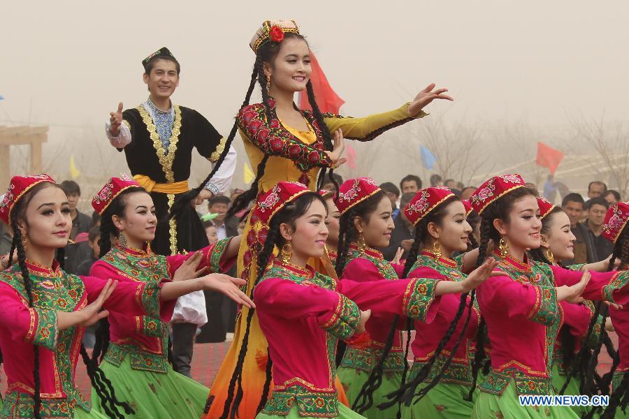 Girls of Uygur ethnic group dance to celebrate the Noruz Festival marking the start of spring plowing in Wupu Township, Hami, northwest China's Xinjiang Uygur autonomous region, March 19, 2014. The Noruz Festival is one of the most significant festivals shared by various ethnic groups in Xinjiang, including Kazahk, Uygur, Uzbek, and so on. [Xinhua/Cai Zengle]