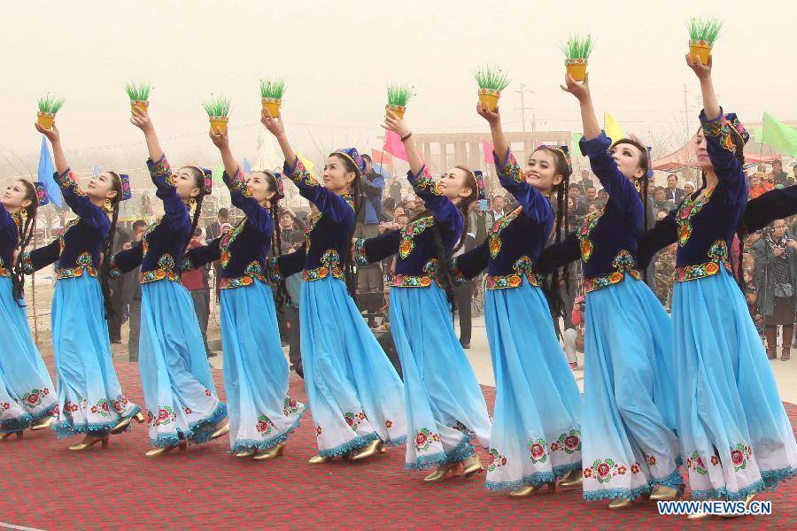 Girls dance to celebrate the Noruz Festival marking the start of spring plowing in Wupu Township, Hami, northwest China's Xinjiang Uygur autonomous region, March 19, 2014. The Noruz Festival is one of the most significant festivals shared by various ethnic groups in Xinjiang, including Kazahk, Uygur, Uzbek, and so on. [Xinhua/Cai Zengle]