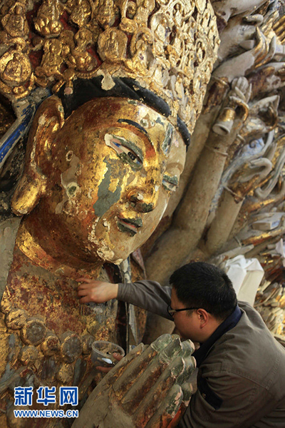 A restoration expert takes off the unstable gold leaves on the surface of the statue of Buddha in Dazu Stone Carvings in Chongqing on March 18, 2014. (Xinhua/Luo Guojia)