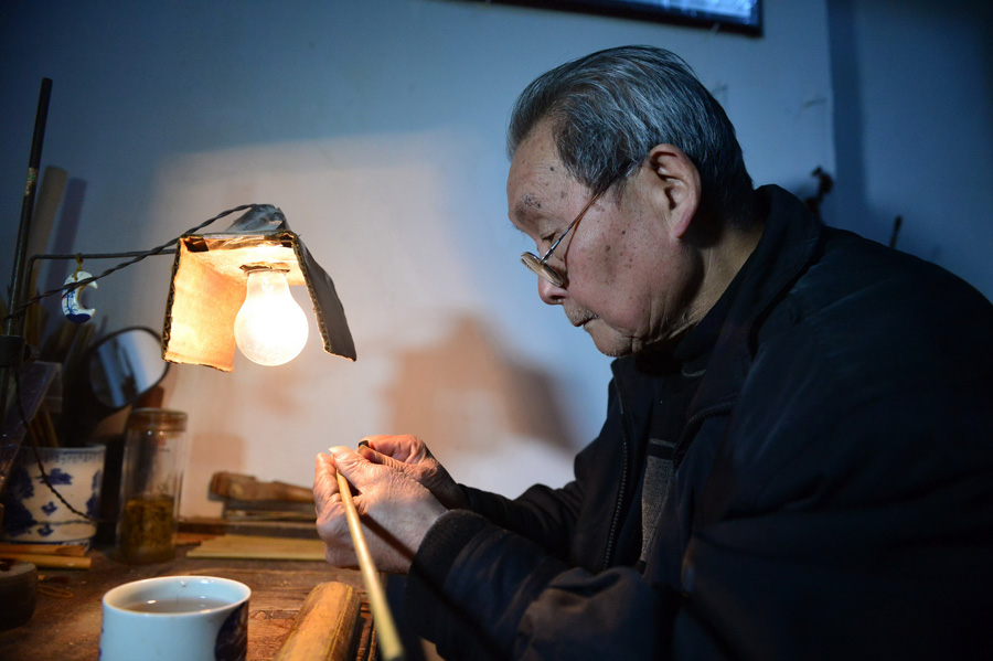 Sheng Songbai, owner of Sheng’s Brush Store in Jingde Town in central China’s Jiangxi province, inherited the handicraft of making brushes for pottery from his grandfather and has passed it on to his daughter and granddaughter. The process of making a brush for pottery is time-consuming and has low economic benefits, so few people are willing to learn the craft and the number of traditional brush stores in Jingde Town is also declining. The Sheng’s brush still persists in carrying on this traditional handicraft.