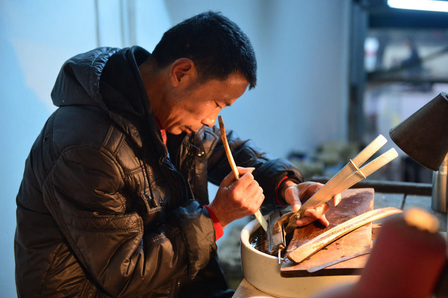 A craftsman makes brushes with a bone comb. (Xinhua/Zhou Mi) |
