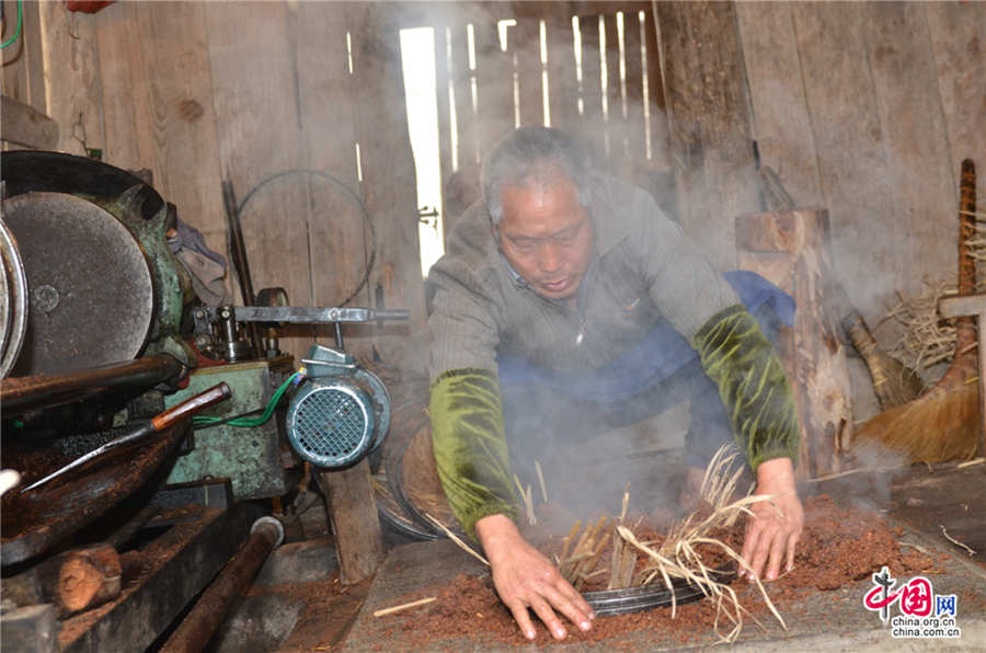 Li Huidou makes a tea-seed cake with hot powder. (Photo/china.com.cn) |