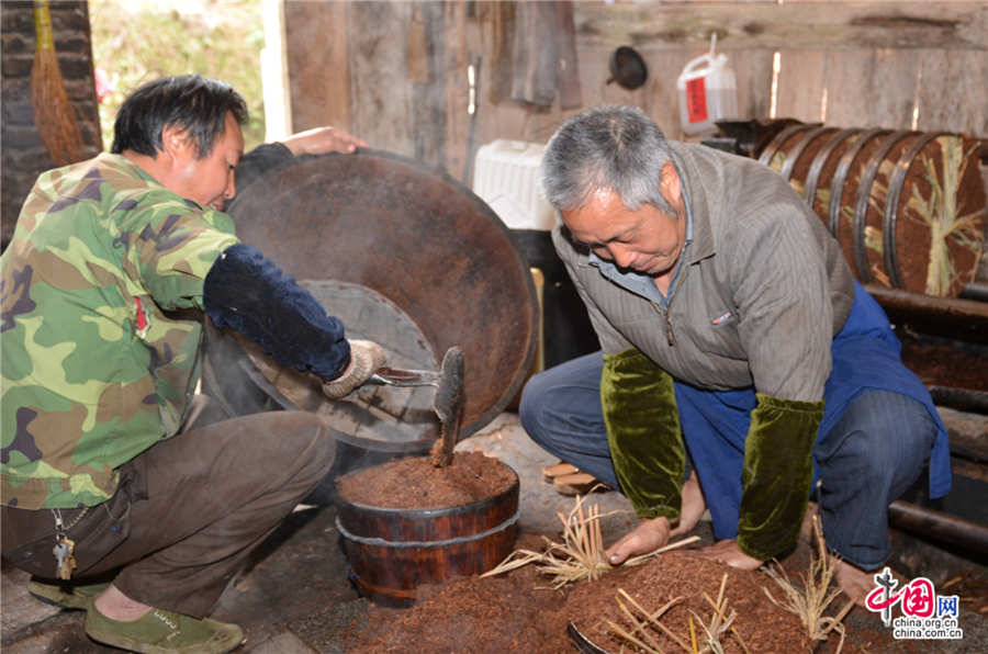Li Huidou and his brother make tea-seed cakes together. (Photo/china.com.cn) |