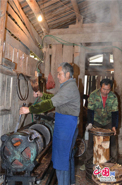 Li Huidou and his brother press oil together. (Photo/china.com.cn) |