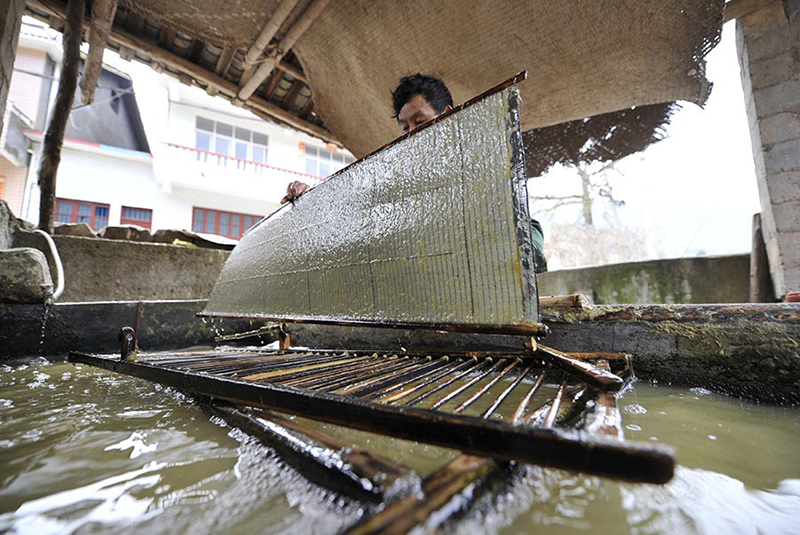 Papermaking worker Xie Yaohui shows centuries-old handmade paper skill in Laopeng village of Zhangjiajie, central China’s Hunan province on March 21, 2014. (Xinhua/ Shao Ying)