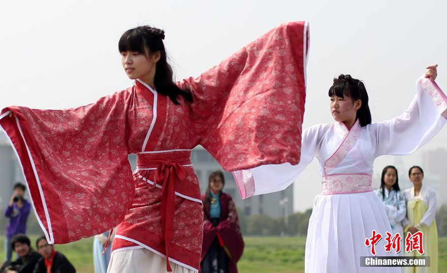 College students in Han costumes celebrate Shangsi Festival in Southeast University in Nanjing, capital of southeast China's Jiangsu province, March 30, 2014. [Chinanews.com/Yang Bo]