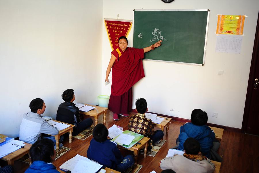 Gazang Jiacuo, a Tibetan monk and Thangka painter, is teaching students basic Thangka painting skills at his Regong Ethnic Culture Palace in western Qinghai province. The photo was taken on March 18, 2014. [Photo / Xinhua]