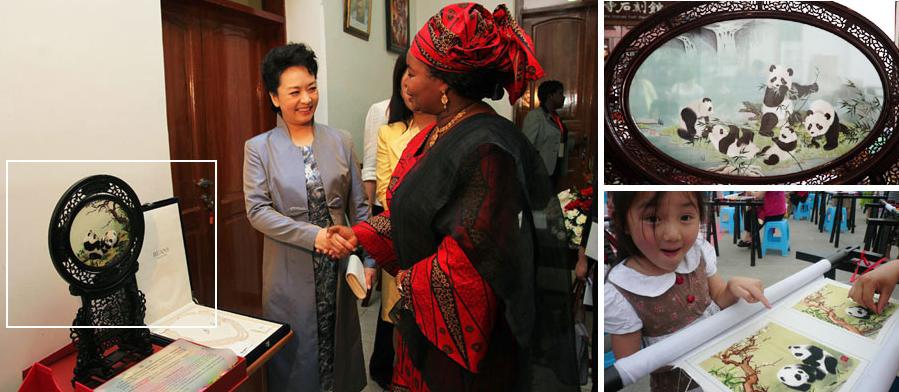 When Peng Liyuan visited the Women and Development Foundation in Tanzania she donated a Shu Embroidery of a giant panda to the foundation. Shu Embroidery is one of the four kinds of embroidery in China, together with Su Embroidery in Jiangsu province, Xiang Embroidery in Hunan province and Yue Embroidery in Guangdong province.