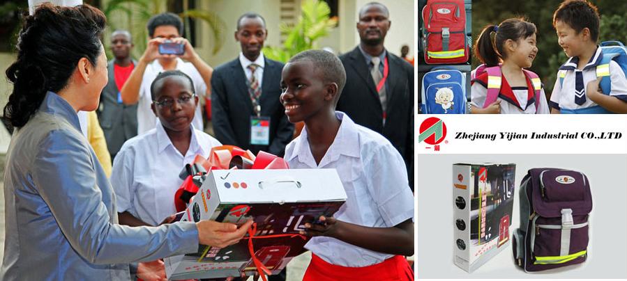 When Peng Liyuan visited the Women and Development Foundation in Tanzania she also donated a school bag produced by Zhejiang Yijian Reflective Material Manufacturing Co Ltd to the foundation.