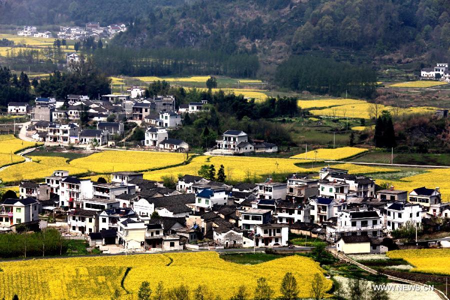 Residential buildings are seen in the cole flower fields in Yixianke Village of Huangshan City, east China's Anhui Province, April 4, 2014. Photo/Xinhua]